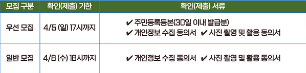 ※ 우선모집 접수자의 경우 4/5(일)까지 30일 이내 발급된 주민등록등본을 지참하시어