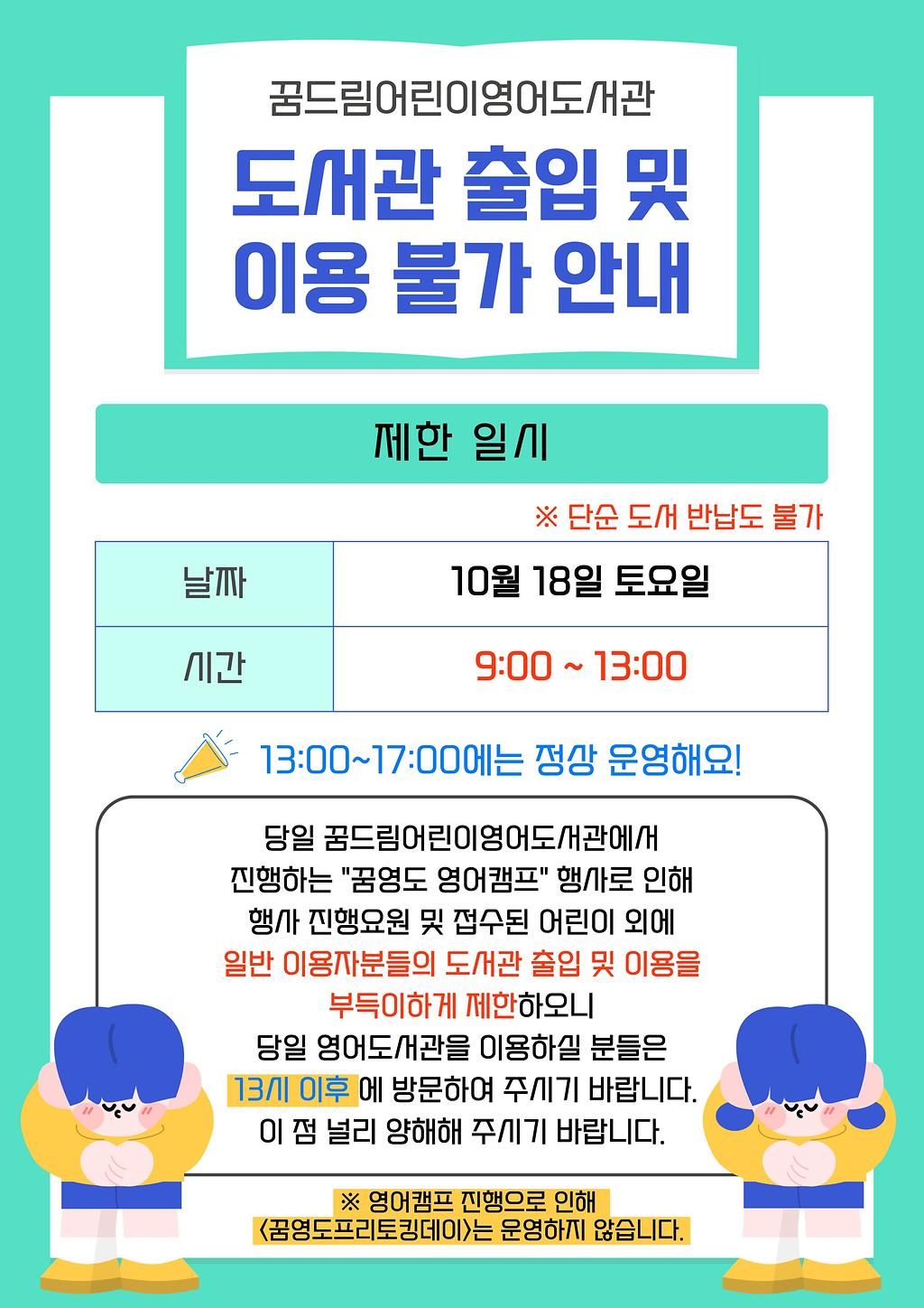 10월 18일(토)은 '제10회 꿈영도 영어캠프' 운영 예정입니다.