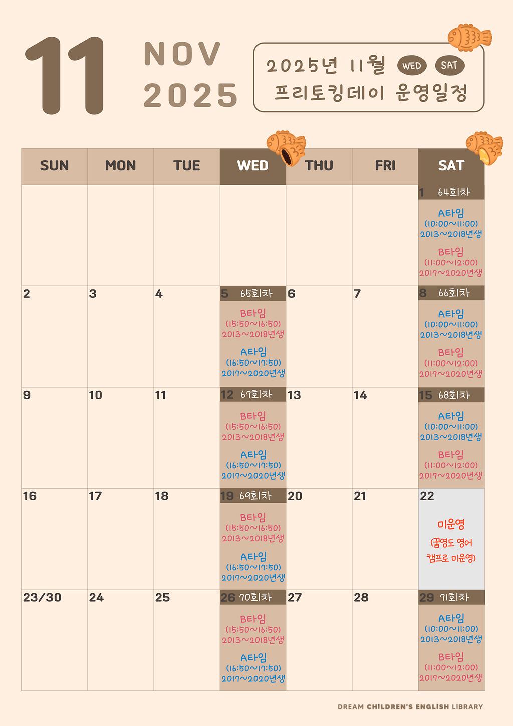 '꿈영도 프리토킹 데이' 11월 운영 달력입니다.