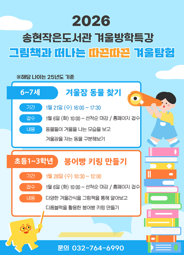 ※25년 기준 6~7세 - 참여 수강생 본인의 아이디로 신청바랍니다. (보호자 아이디로 신청 시, 보고란에 반드시 아이정보(성명, 학년 또는 생년월일)을 입력해주세요. 입력하지 않을 시 신청이 취소될 수 있습니다) - 접수가 된 경우 "교육문화행사-프로그램-신청내역"에서 확인할 수 있습니다. - 대기 후, 취소자가 있을 경우 순서대로 연락드리며, 2회 이상 연락이 안될 경우 다음 순번에게 넘어갑니다.