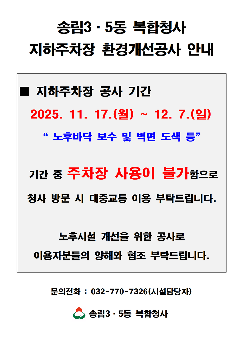 [11/17(월) ~ 12/7(일)] 송림3·5동 복합청사 지하주차장 환경개선공사 안내